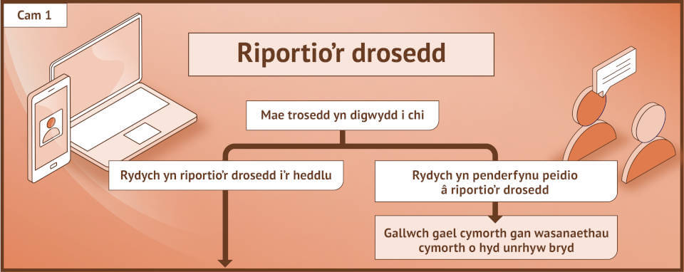 Mae taith pob dioddefwr yn dibynnu ar y drosedd, canlyniad yr ymchwiliad a mynediad at wasanaethau cymorth, ond mae’r hawliau y gall pob dioddefwr ddisgwyl eu cael wedi’u nodi yn y Cod Dioddefwyr.
