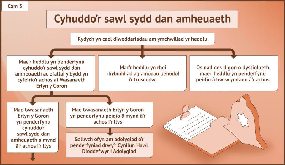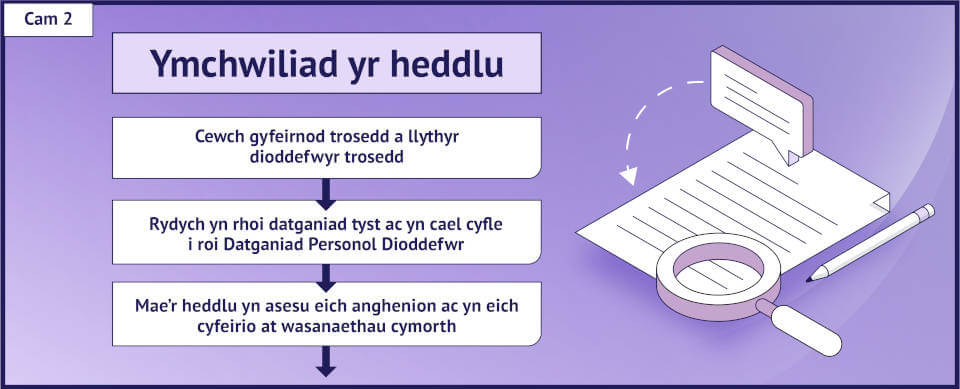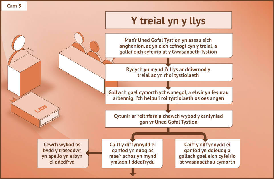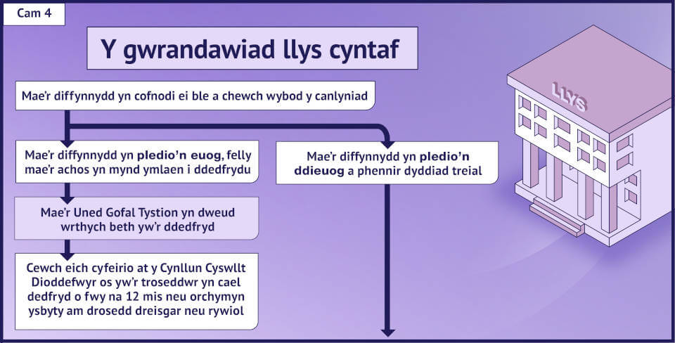 Gall mynd drwy’r system cyfiawnder troseddol deimlo’n frawychus ac yn llethol. Mae’r trosolwg syml hwn yn mapio taith dioddefwr drwy bob cam i’ch helpu i ddeall sut mae’r broses yn edrych a sut y mae’r gwahanol gamau yn gysylltiedig â’i gilydd.